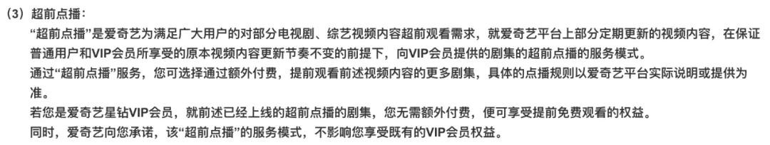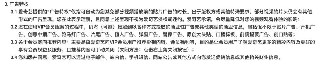 對於廣告,愛奇VIP會員服務協議這樣寫道,會員在使用VIP服務時,仍將(可能)接觸到商業性廣告,包括但不限於貼片廣告、開機廣告、創意中插廣告、跑馬燈廣告、片尾廣告、植入廣告、彈窗廣告、暫停廣告等。