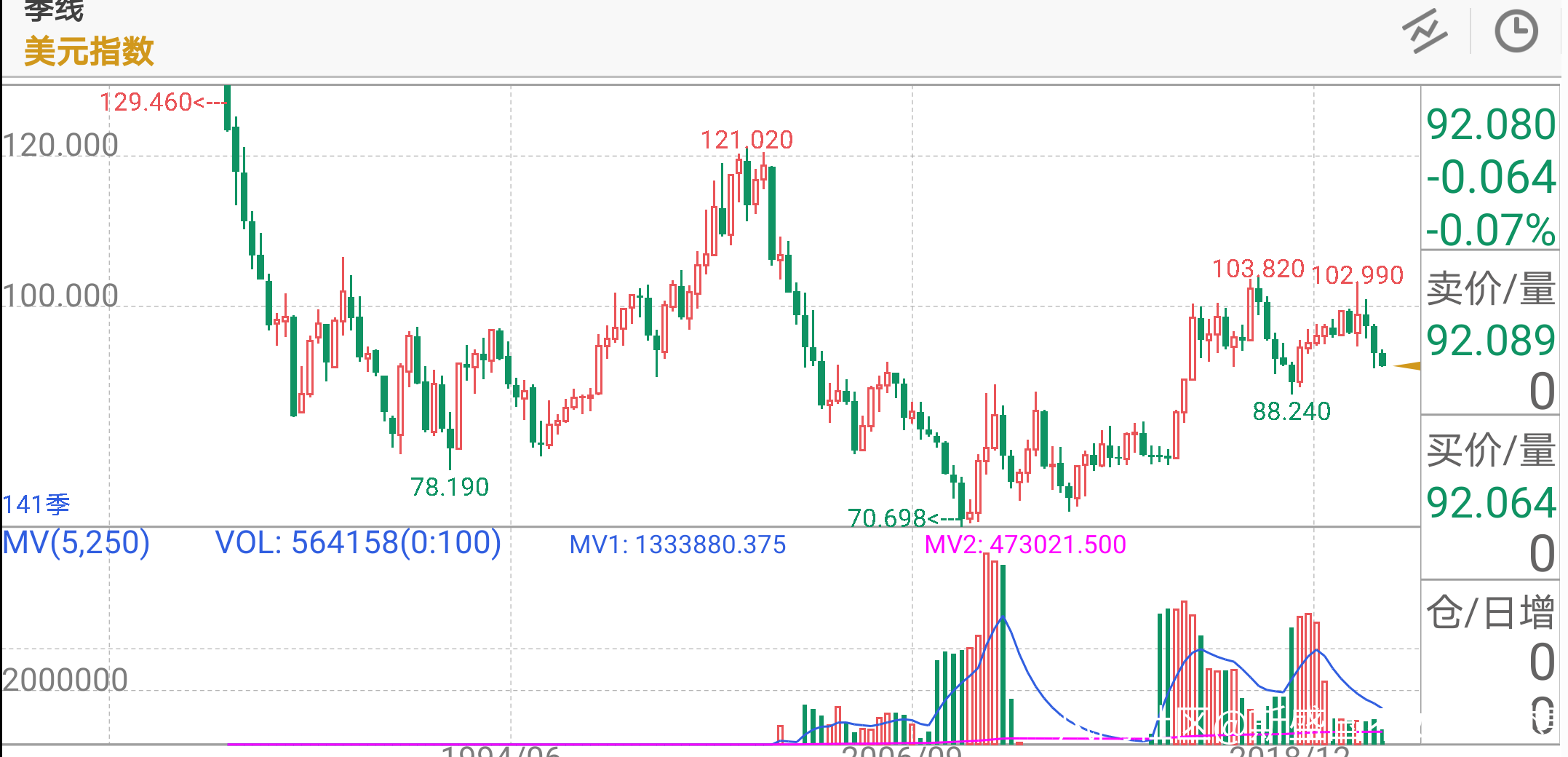 141季美元走勢圖。第一根季k線為1985年12月31日形成。現階段元基於其自身國力衰落問題與不可持續債務問題及經濟股市泡沫問題和各種內部矛盾暴發問題,大勢已無法向上,只能向下墜落,走不斷尋底過程(看其矛盾解決程度,及期間其將發起何種美元食利操作手法)。