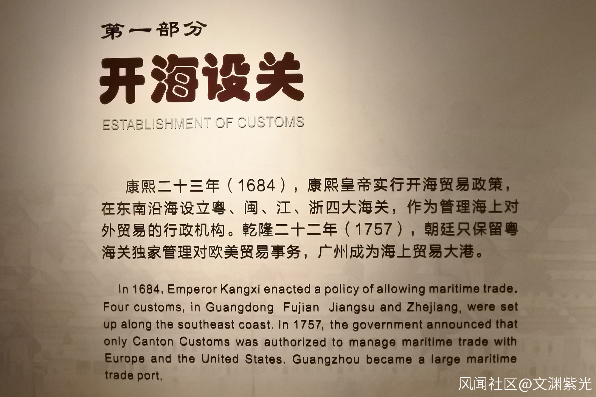 **開海設關:**康熙二十三年(1684),康熙皇帝實行開海貿易政策,在東南沿海設立粵、閔、江、浙四大海關,作為管理海上對外貿易的行政機構。乾隆二十二年(1757),朝廷只保留粵海關獨家管理對歐美貿易事務,廣州成為海上貿易大港。