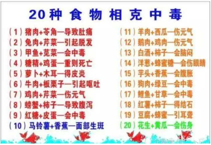 柿子和螃蟹一起吃會得結石、豆腐加蜂蜜會耳聾、蘿蔔加木耳會得皮炎、蝦與水果同食會致“砒霜中毒”……