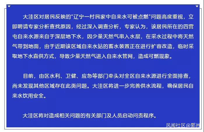 11月22日,遼寧盤錦大窪區趙圈河鎮四營屯村的文女士在網上傳的一段視頻顯示,她家水管裏流出來的自來水,用打火機能點着。當天,當地政府關停了問題轄區的自來水井,併成立了聯合調查組。