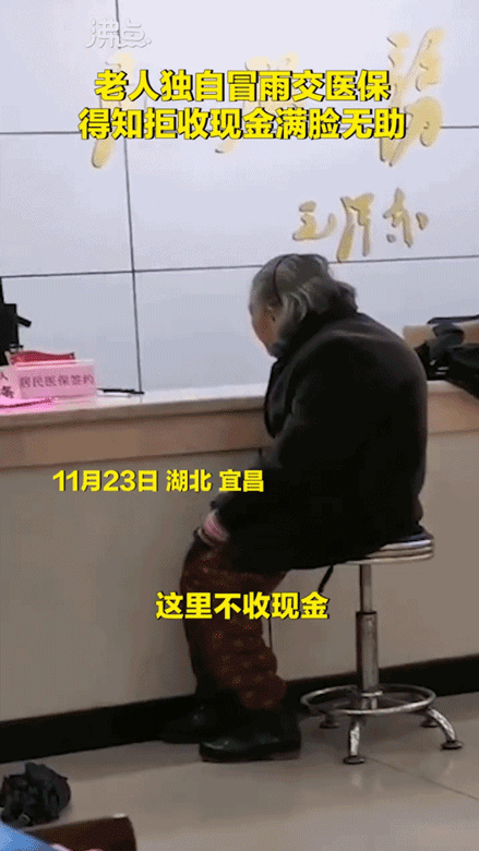 一位頭髮花白的老太太冒雨去交醫保,結果被工作人員告知不收現金,要麼找親戚幫忙,要麼手機支付,只有這兩個方式。