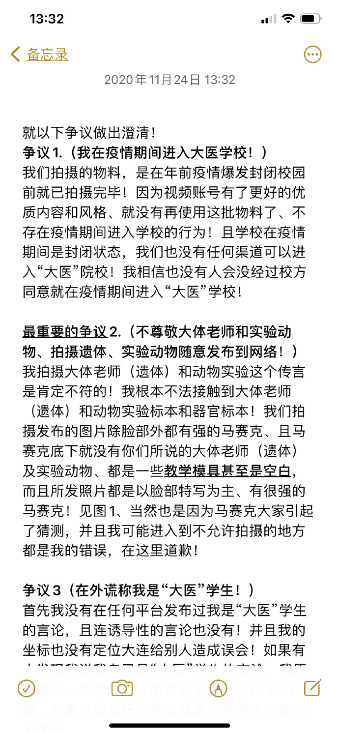 @澤一鋒 還稱,自己並非大連醫科大學學生,也不是法醫學生,曾經自稱法醫只是為了“玩梗”。最後,他道歉稱,以後會更加謹慎地拍攝視頻,並立即刪除相關爭議視頻。
