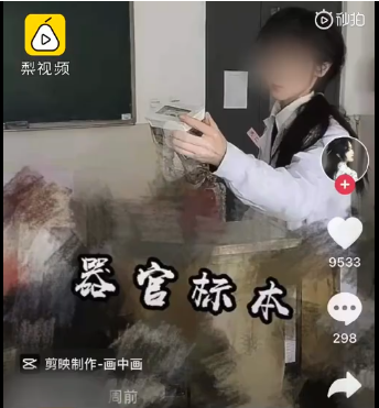 在網友提供的截圖中,短視頻平台網紅@澤一鋒 近日發佈了其在高校解剖館拍攝的視頻,打碼處疑似出現大體老師和實驗動物標本,畫面中還標註了“兔子解剖”和“器官標本”的字樣。