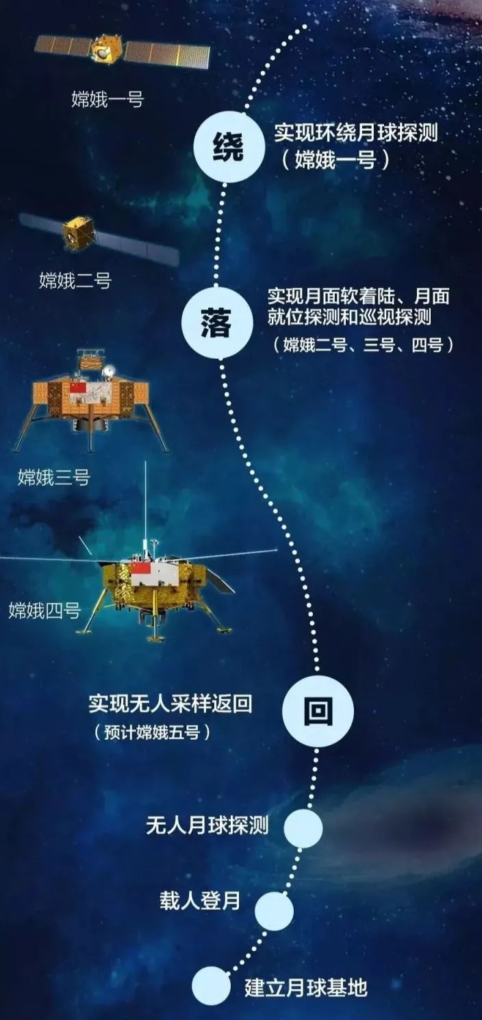2013年12月,嫦娥三號在月球上軟着陸, 2019年1月,嫦娥四號成為世界上首次在月球背面軟着陸的探測器。現在的嫦娥五號,將擔負起返回的重任。