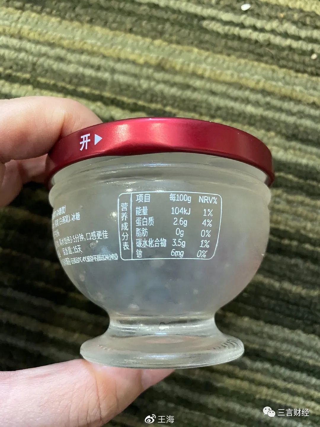 王海消費364元購買3瓶70克包裝的小仙燉鮮燉燕窩,根據產品成分表顯示,每100克包含2.6克蛋白質,相當於一顆雞蛋的三分之一。