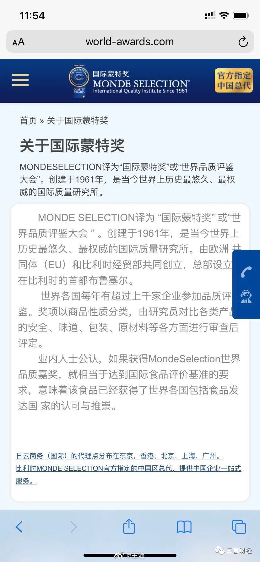 據調查,所謂蒙特獎,即MONDESELECTION,通常譯為“國際蒙特獎”或者“世界品質評鑑大會”。創建於1961年,其代理商網站宣傳稱是歷史最悠久、最權威的國際質量研究所。由歐洲共同體和比利時經貿部共同創立,總部設在比利時首都布魯塞爾。