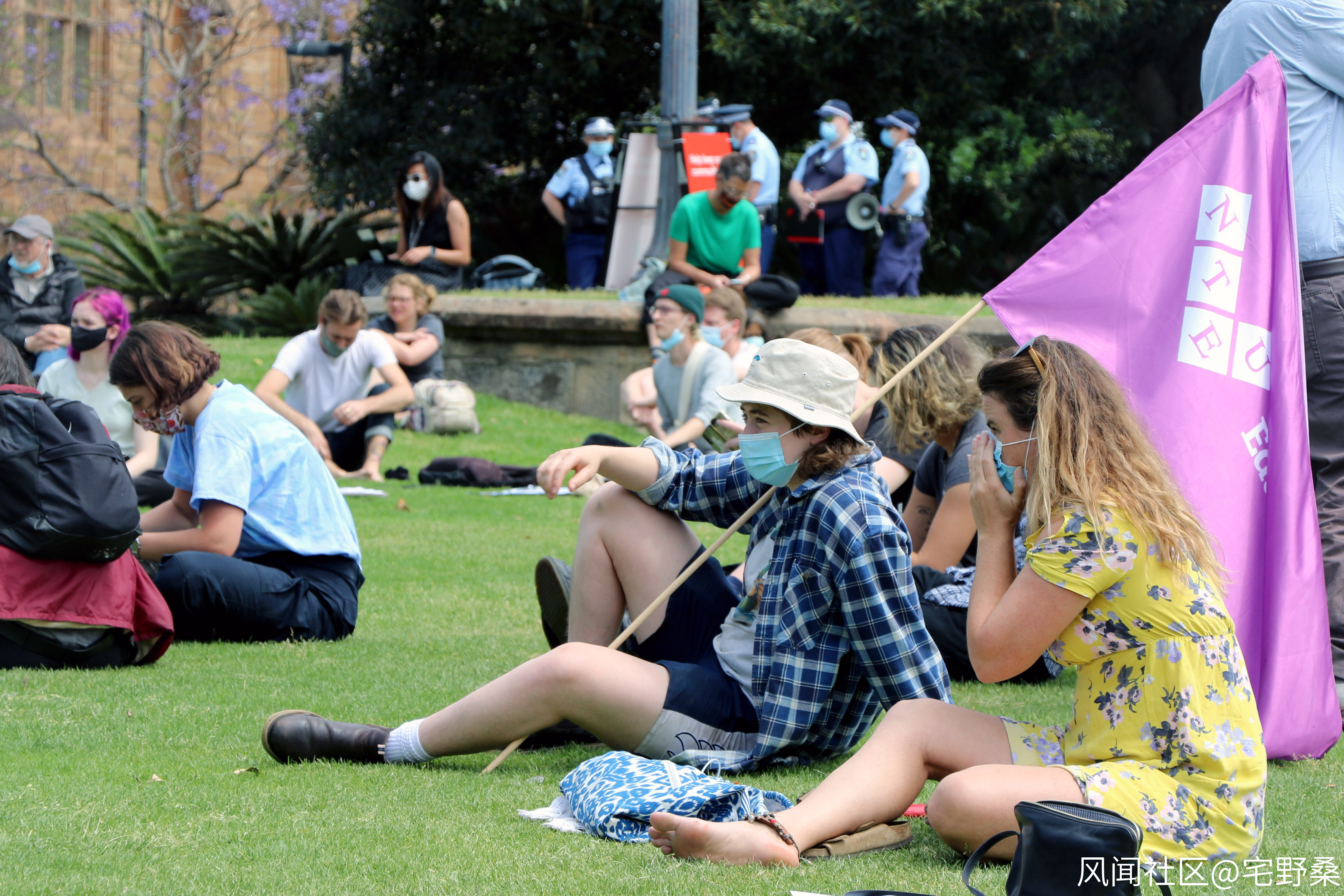 和狹長的UNSW校園相比,悉尼大學的佈局更加容易迷路。但是,當天通往集會現場的路無比清晰,因為距離集會地點越近,巡邏的警察的數量顯而易見的就越多。如果新南威爾士大學校園裏的警察是來監視學生集合的,那悉尼大學裏的警察密度幾乎就是來閲兵的。無論你從任何一個角度拍攝集會的現場,你都能夠在背景裏找到警察的身影。在悉尼大學古樸典雅的黃色教學樓下,藍色的警察制服是那樣的醒目。“BLM抗議被叫停,Trans的抗議活動被叫停,學生的抗議活動每次都被叫停”當演講者發表這樣的抱怨時,兩輛警車十分配合地從鋪滿學生的草坪旁呼嘯而過,不僅僅車裏塞滿了警察,每輛車的踏板兩側還站着不少的警官,他們牢牢地抓着車頂的把手,不禁讓人想起第二次世界大戰期間滿載着步兵的坦克。但是,這些警察的敵人在哪裏呢?——這裏可沒有武裝到牙齒的納粹分子,只有手無寸鐵的學生和老師。