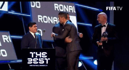 説到C羅和馬拉多納,人們就會想起2017年馬拉多納作為嘉賓,為C羅頒發世界足球先生獎項。
