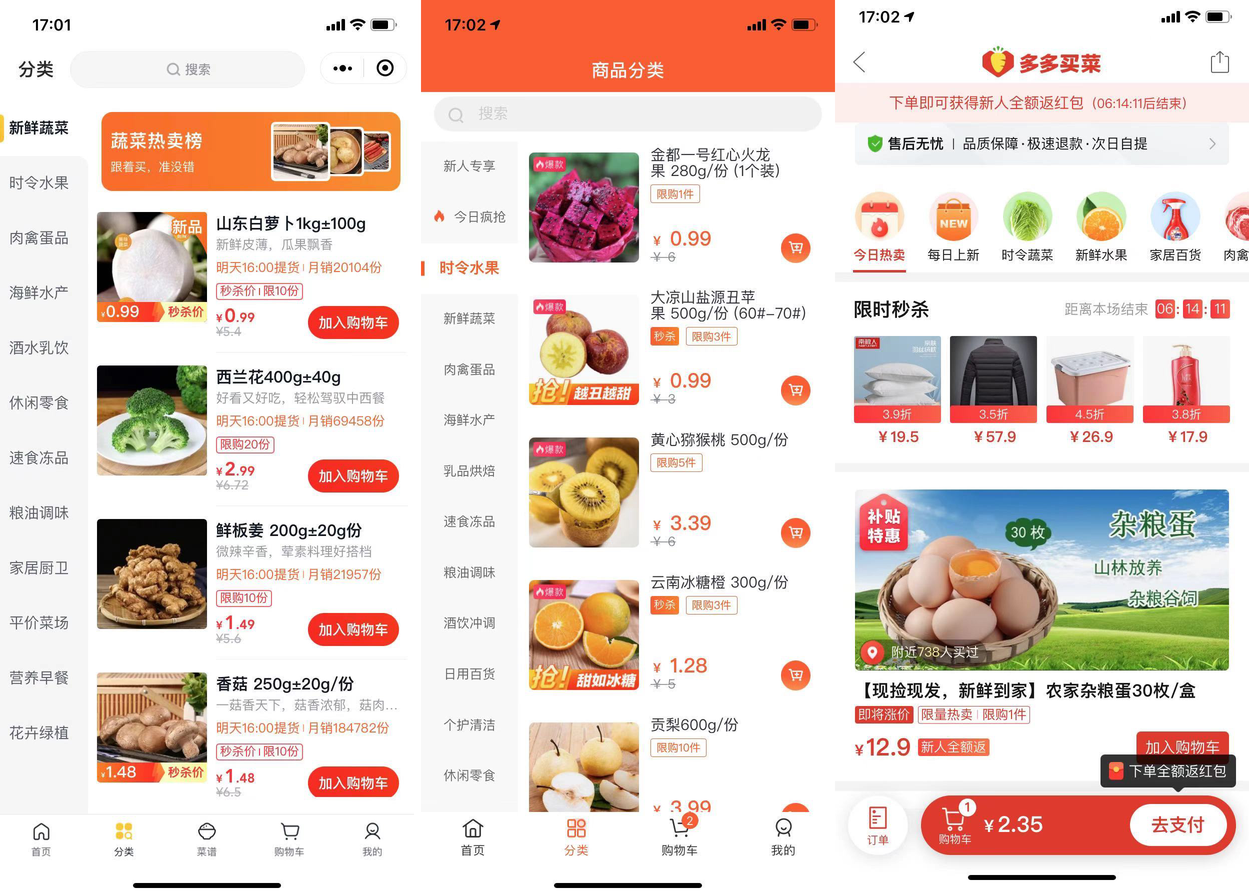 剛上線的多多買菜在SKU方面則相對較少,但是,拼多多在下沉市場深耕多年。無疑,多多買菜在農產品供應具有先天優勢。
