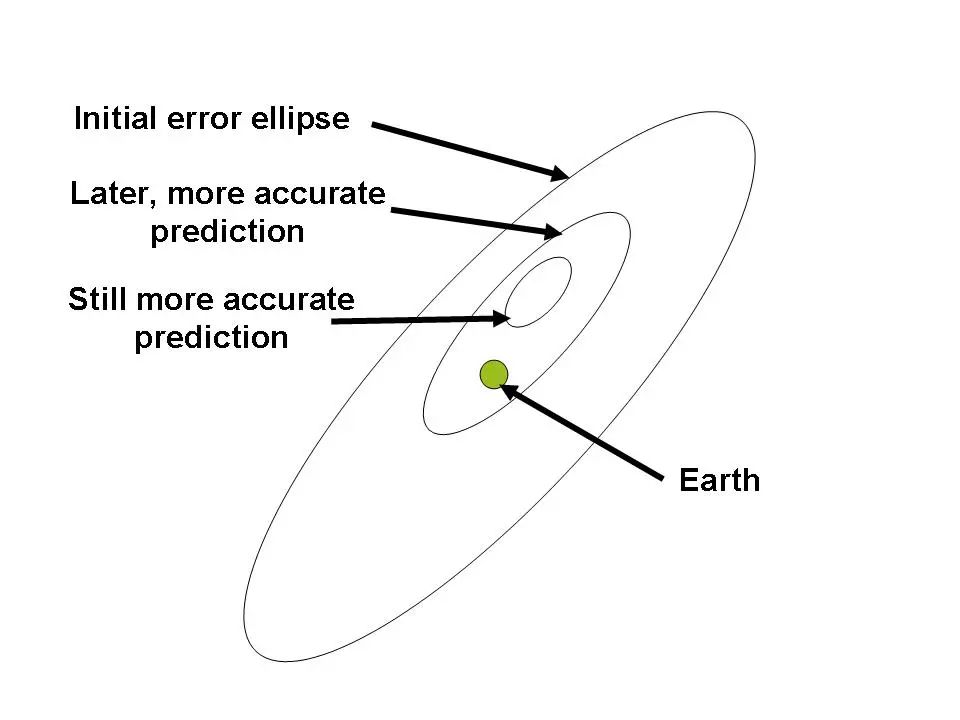 三個預測的撞擊可能範圍中,外圈是最早期的錯誤預測,中間的是後續的預測,內圈是更精準的預測。目前已排除2029年毀神星撞擊地球的可能。