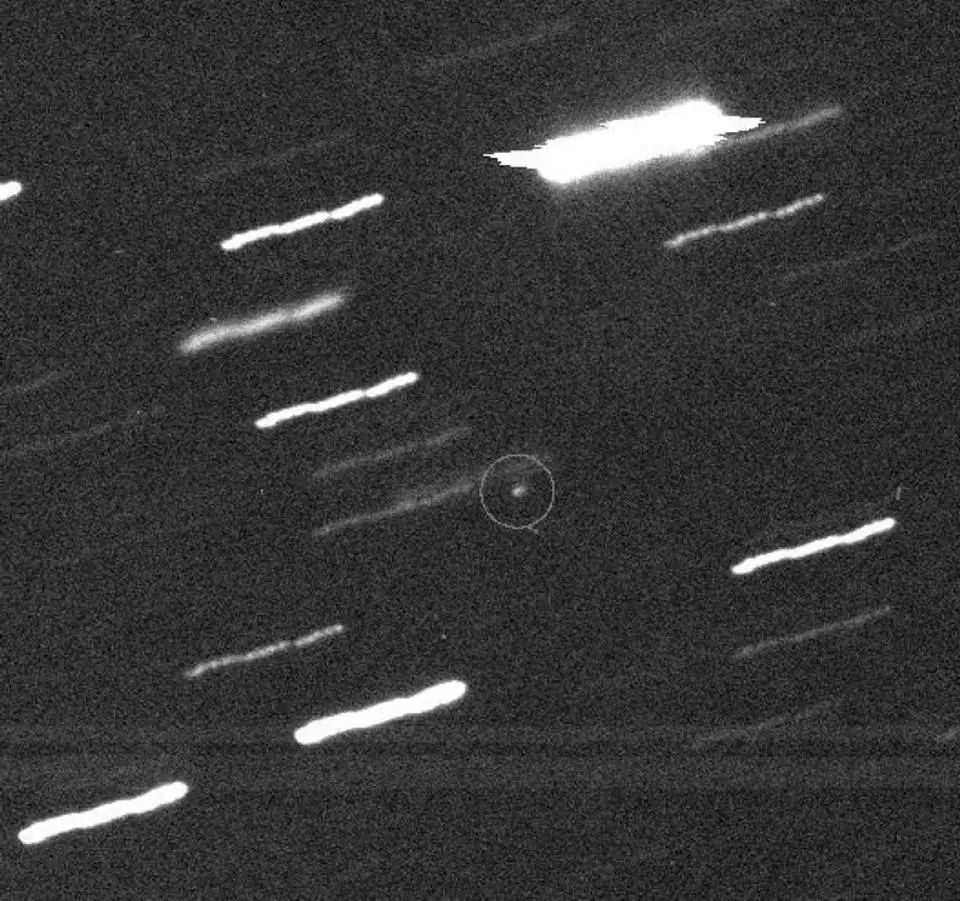 5次曝光照片中的毀神星(圓圈標記),我們還可以看到星軌。本世紀中,毀神星將在2029年、2036年和2068年靠近地球。
