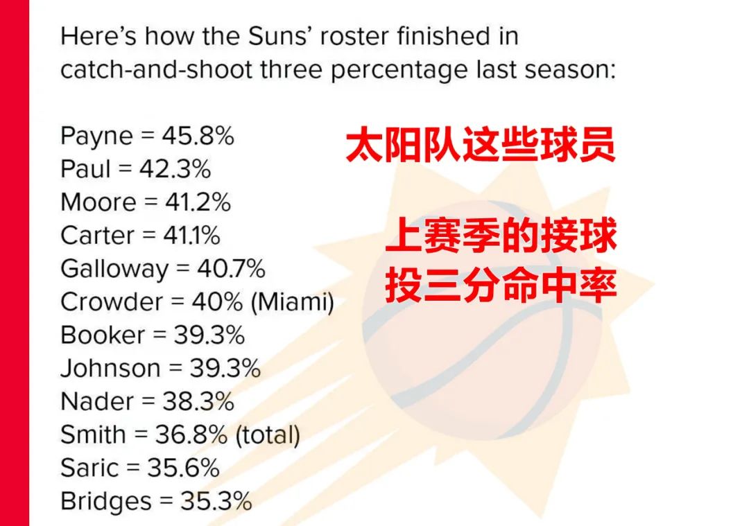 瓊總在選人時,首先挑會投籃的人。他換來了保羅和埃及小前鋒納德爾,簽了克勞德、伊唐·摩爾、加洛維,續簽薩里奇和傑旺·卡特,甚至選秀挑的杰倫·史密斯,這些人都會投籃。這裏有一張表,單以上賽季的表現,太陽隊這些球員(除了中鋒艾頓)的接球投三分命中率,個個都在35%以上,多數超過38%,有6位超過40%。