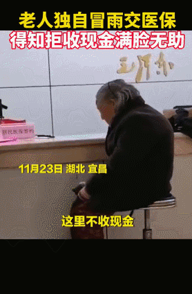 11月23日,一則視頻在網絡上熱傳,湖北宜昌一位老人冒雨到村代收點交醫保,現場工作人員卻告訴她不收現金,“要麼告訴親戚,要麼自己在手機上支付。”視頻中工作人員身後“為人民服務”的幾個大字在默然無語的老人面前顯得尤為諷刺。