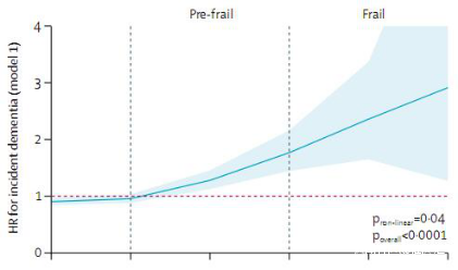 在5.4年的中位隨訪期期間,有726名參與者發展成了痴呆症,相比非虛弱個體而言,在完全調整的模型中,虛弱前期參與者(風險比1.21[95%CI:1.04-1.42])和虛弱期參與者(風險比1.98[95%CI:1.47-2.67])患痴呆症的風險均會增加。
