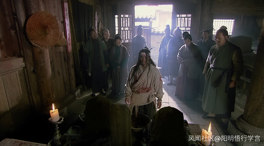 大家注意這時候鄰居們還坐在屋裏,土兵還守着現場。武松把兩顆人頭往武大郎靈牌前面一放,手裏端起這杯冷酒,説哥哥在天之靈慢走,兄弟已經給你報仇了。在這裏的我們還再一次強調,武松始終讓這幾個鄰居處於事發現場第一現場,為的就是能夠保證有證人有觀眾,將來自己在道義上在法律上都能站住腳,如何把這個案子結案,如何證明自己哥哥的冤屈和自己報仇的正當理由,武松啓動了接下來的方法。他帶着這幾個鄰舍,壓着王婆,拿着呈堂證供到縣衙裏面來報案。那武松接下來怎麼報案的呢?