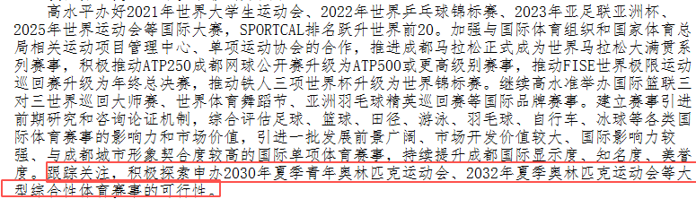 跟蹤關注,積極探索申辦2030年夏季青年奧林匹克運動會、2032年夏季奧林匹克運動會等大型綜合性體育賽事的可行性。