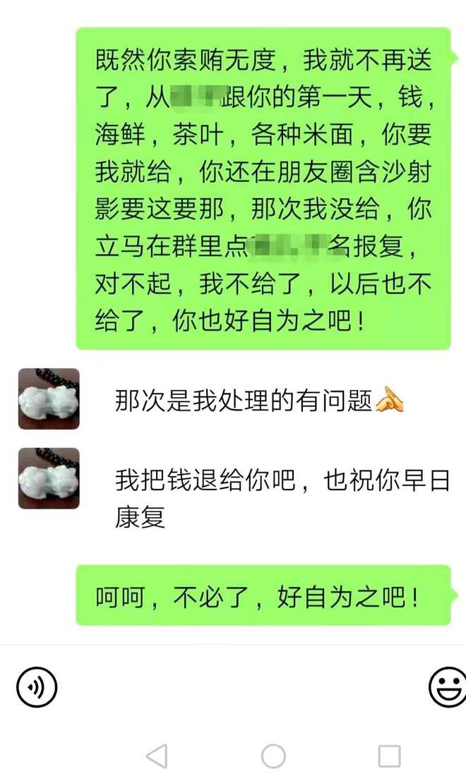 她很生氣地質問曹老師:不是給你説明過情況了嗎,你為何還要這樣?她的理解,曹老師此舉,是提醒她又該送禮了。她就告訴曹老師:你要什麼我都給,既然這樣的話你再要什麼,對不起,我都不給了。曹老師回覆他説:要不我把錢退給你吧。而她卻説不必了。