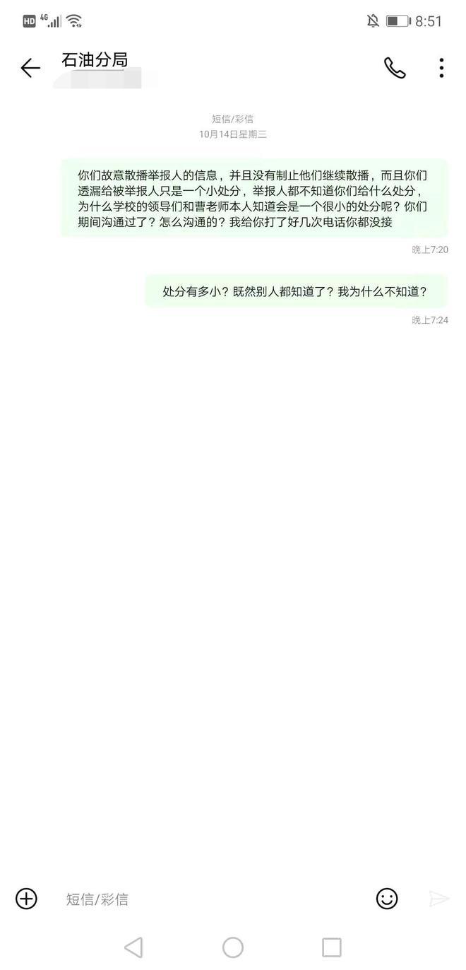 13日當天,汪文月便打電話給孟校長和滄州市教育局石油分局相關調查人員,雙方都否認是他們泄露了她的舉報者身份。次日,她見到孟校長時,再次詢問此事,孟校長開着語音聯繫了滄州市教育局石油分局基礎教育科的張科長。張科長説,曹老師犯的錯誤他們已經調查清楚,他們肯定會給予處分;如果對處分不滿意,還可以向上級反映。至於誰泄露了舉報人的信息,跟他們沒有關係。