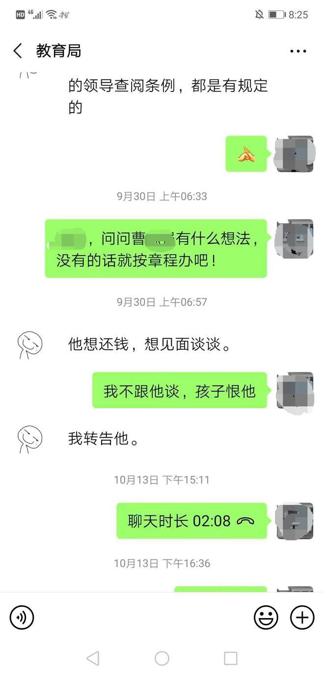 第二天,調查人員向她反饋:她的舉報屬實,曹老師自己也承認了,並詢問她有什麼可以解決的辦法沒有。汪文月説,直到此時,她都沒有想到處分曹老師的事兒。在她看來,曹老師既是他的老師,又有教學能力,她委婉地表達了道個歉就算了。他還問曹老師自己想怎麼辦,調查人員説“曹老師想還錢,並想跟你見面談談”。上述相關微信對話記錄,她做了截屏。