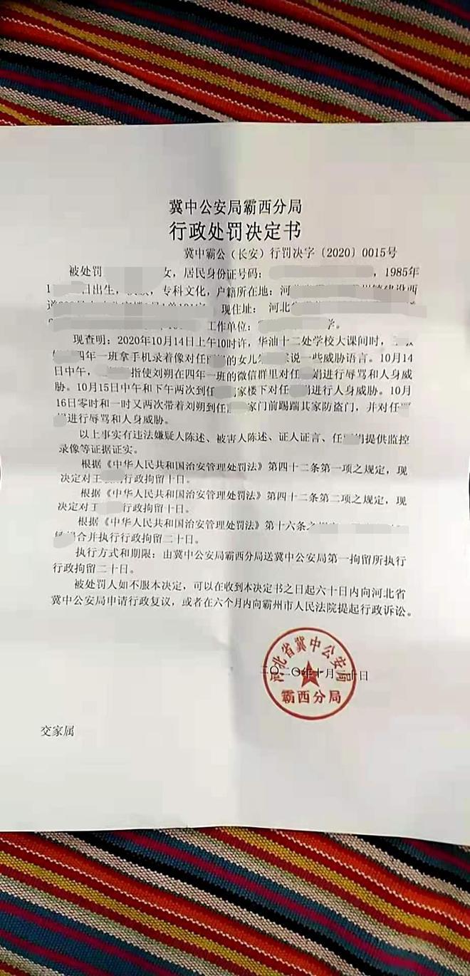 汪文月向記者提供了兩份《冀中公安局霸西分局行政處罰決定書》。在編號為冀中霸公(長安)行罰決字(2020)0014號中,稱汪文月因其觸犯《治安管理處罰法》地二三十條第一款第一項之規定,對其行政拘留10日。事由是10月26日14時許,朱某(任某女兒)正在學校操場上體育課,汪文月帶其兒子顧明來到朱某身前,雙手抓住朱某的雙肩讓其兒子顧明打朱某,造成教學秩序無法正常開展。