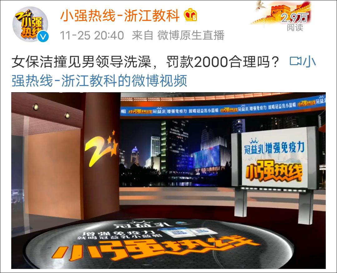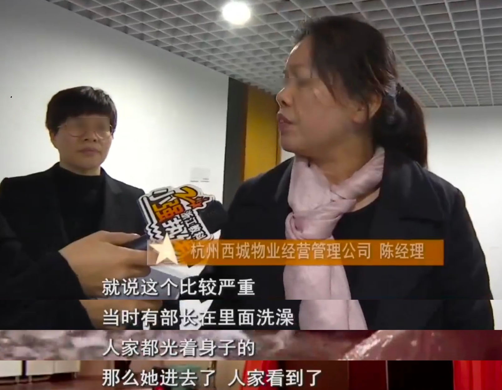 據浙江電視台教科影視頻道《小強熱線》11月25日報道,杭州的一位女保潔員張女士,工作時上樓拿工具,沒有敲門就進入了男浴室,恰好裏面有男士在洗澡,她因此被投訴。