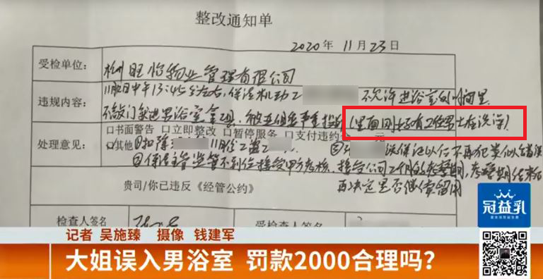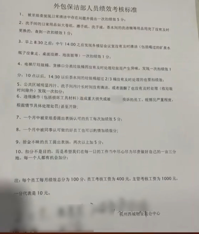 張大姐所在公司,即杭州西城物業經營管理公司的陳經理在接受採訪時表示,處罰是按照公司與員工簽訂的考核制度來的。開會時也有提到,且在該公司出具的文件中,張大姐也簽了字。