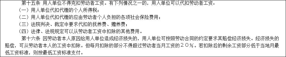 《工資支付暫行規定》第十六條寫道:因勞動者本人原因給用人單位造成經濟損失的,用人單位可按照勞動合同的約定要求其賠償經濟損失。**經濟損失的賠償,可從勞動者本人的工資中扣除。但每月扣除的部分不得超過勞動者當月工資的20%。**若扣除後的剩餘工資部分低於當地月最低工資標準,則按最低工資標準支付。