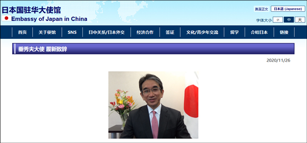 在26日日本駐華大使館網站發佈的新任日本駐華大使履新致辭中,垂秀夫表示,赴華前曾傾聽日本首相菅義偉和所有相關大臣的諄諄教誨,並與約150名日本國會議員和100餘家企業高管等交換意見。垂秀夫稱,其間常常聽到這樣的話,即“日本的未來取決於今後的對華政策抉擇”。