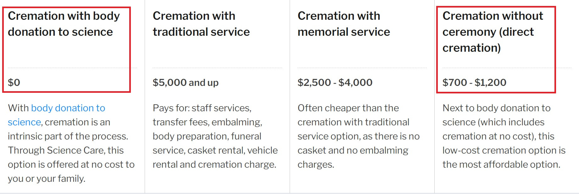 如果能把遺體捐獻給科研機構可以“免費去死”,否則,直接火化的最低費用要700美元!