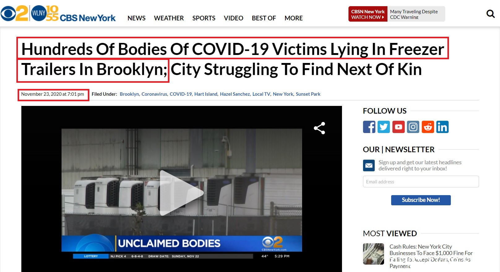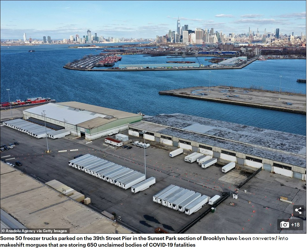據紐約市首席體檢官辦公室稱,布魯克林海濱臨時停屍間內約有650具屍體,該辦公室對報紙説,紐約市要麼找不到很多死者的家,要麼他們的家人負擔不起適當的葬禮。
