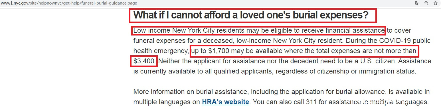紐約低收入居民可能有資格獲得經濟援助,以支付已故的低收入紐約居民的喪葬費。在COVID-19公共衞生緊急情況下,如果總費用不超過$ 3,400,則可用$ 1,700。