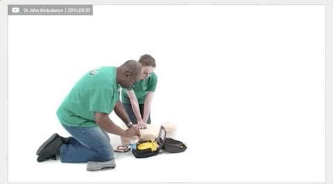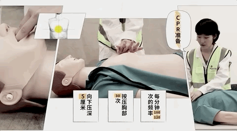 與此同時,你需要對患者進行心肺復甦(CPR),以每分鐘 100~120 次的頻率按壓胸部 30 次,至少向下壓深 5 釐米;接着開放氣道,按額頭抬下巴,清理他的口腔異物,如食物、假牙;然後進行 2 次人工呼吸,吹氣時捏緊他的鼻孔,吹氣後手指鬆開。