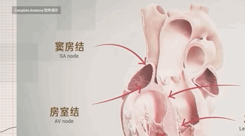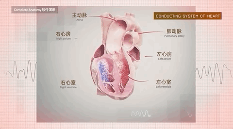 這是一顆正常跳動的心臟。心臟的跳動節奏由竇房結主導,電流信號率先從這裏發出,沿傳導系統刺激心房、心室收縮,將心房裏的血液擠壓進心室,緊接着推動血液向主動脈和肺動脈流動。每分鐘心臟跳動 60~100 次,稱為竇性心律。