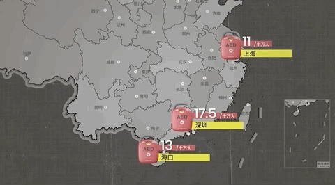 目前,深圳、海口、上海是國內 AED 資源最富饒的城市,每十萬人擁有超過十台 AED。