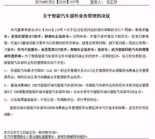 但最近,華為內部對造車給出了明確答覆,確認華為不造車,誰再建言造車干擾公司,將調離崗位。這份文件是由任正非親自簽發。