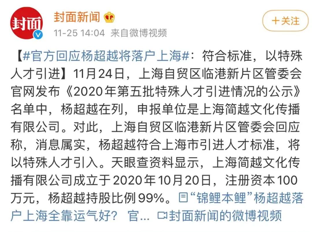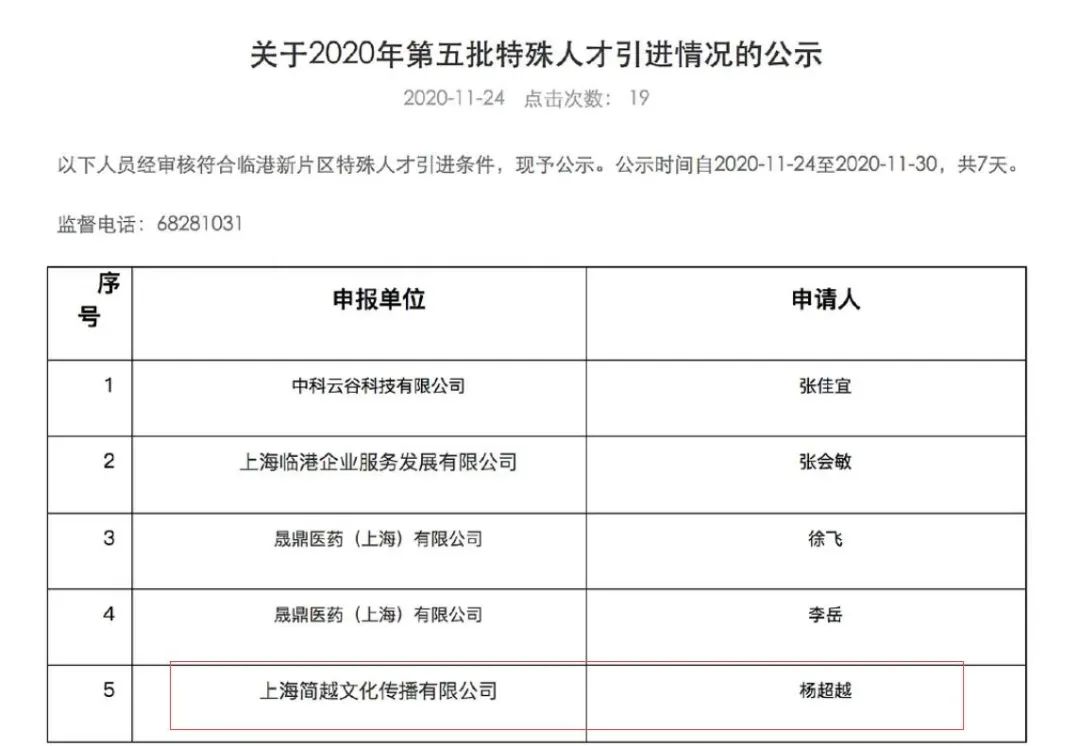 11月24日,上海自貿區臨港新片區管委會官網公佈了一份《2020年第五批特殊人才引進情況的公示》名單,楊超越赫然出現在名單上。
