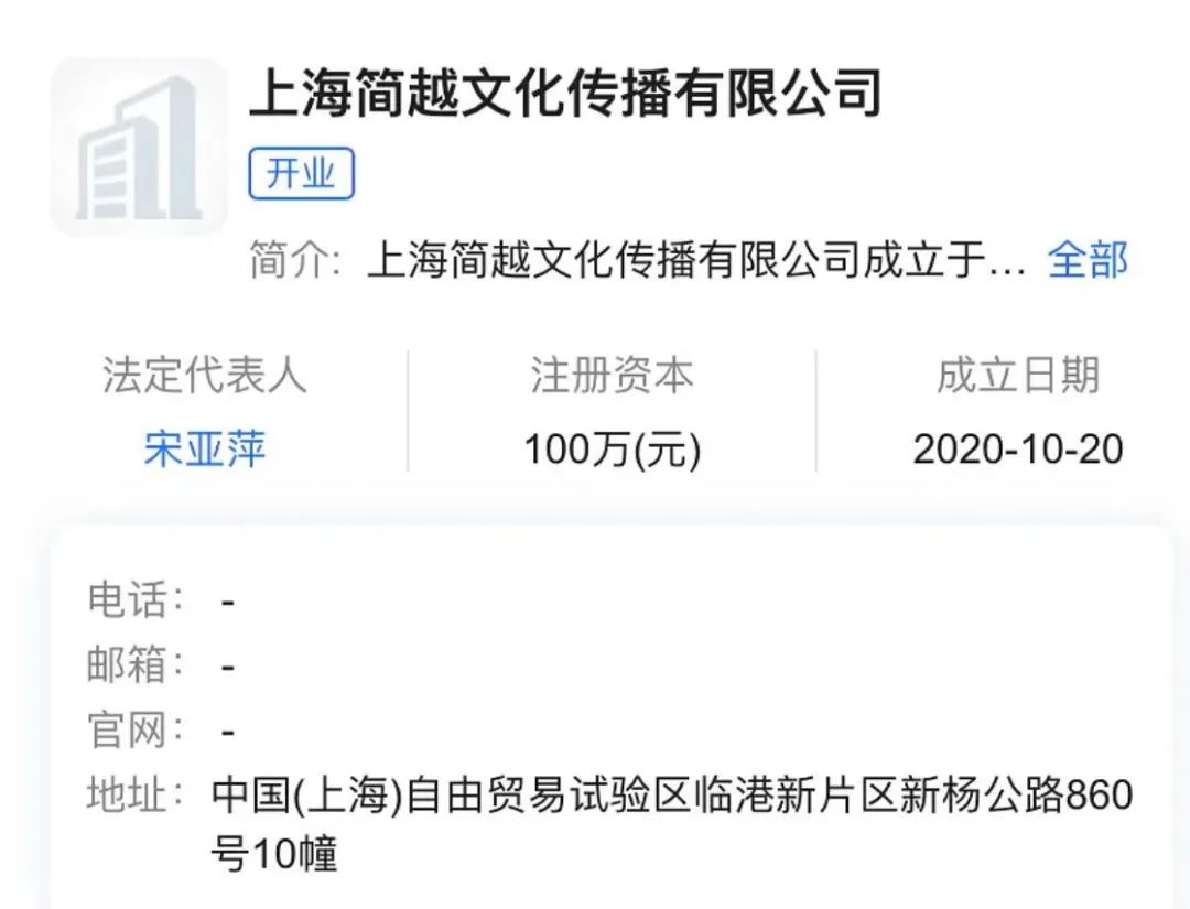 也不是。楊超越的申報單位是上海簡越文化傳播有限公司,楊超越是大股東,公司在2020年10月20號才成立。