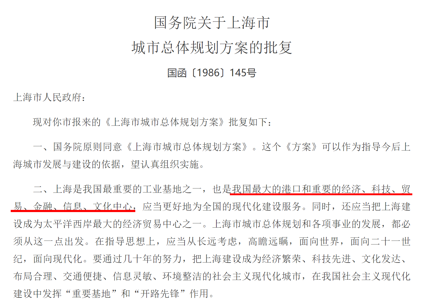 1986年國務院批覆的上海市城市總體規劃,明確提出上海是我國最大的港口城市和重要的經濟、科技、貿易、金融、信息、文化中心,上海一身而兼負六大中心。