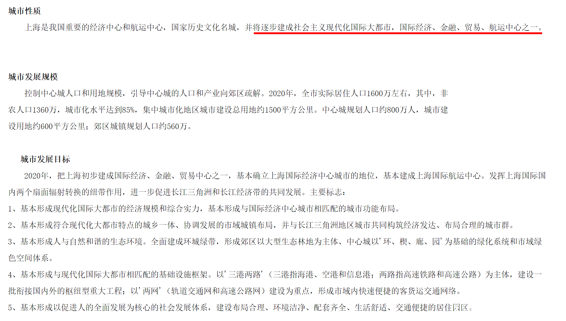 在2001年5月國務院批覆並同意的《上海市城市總體規劃》(1999年-2020年)提出:“逐步建成社會主義現代化國際大都市,國際經濟、金融、貿易、航運中心之一”。