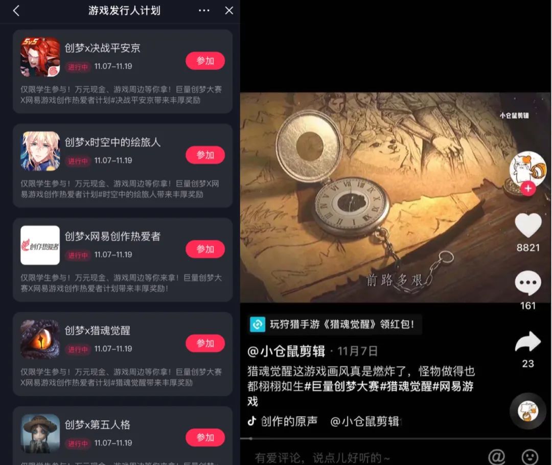 不過即便如此,第一季大賽還是與遊戲品牌主產生了一定交集。比如網易的“創作熱愛者計劃”,旨在幫助優質內容創作者更好地成長,正好和巨量創夢大賽在目標上耦合,於是網易便為此次大賽的學生提供了多類遊戲商單機會和獎勵。
