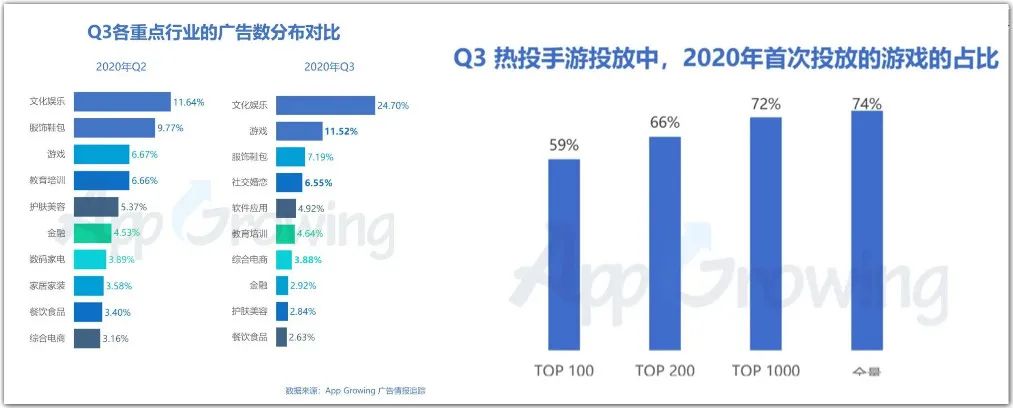 而App Growing發佈的Q3移動廣告投放市場報告顯示,遊戲行業Q3投放廣告數在全行業的佔比相比Q2增加了近5個百分點,同時新投放手遊在大盤中佔比74%,這或許可以反映多數公司推新品的戰略,不僅投,而且要大力度投。
