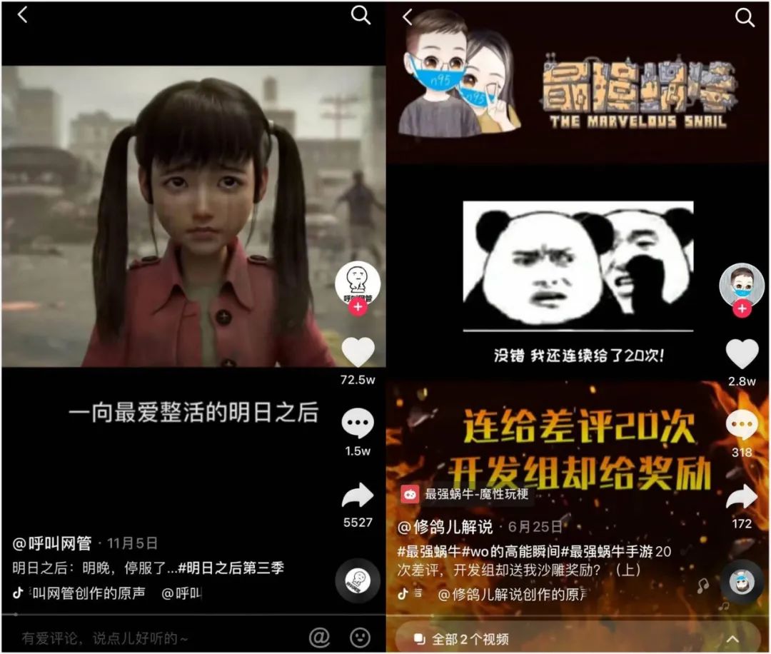 這又分為遊戲達人和非遊戲達人兩種。遊戲達人相對容易理解,比如抖音上粉絲已達千萬量級的“呼叫網管”,其作品多以綜合視角闡釋遊戲背後的故事,不久前發佈了一部講述《明日之後》版本上新營銷事件的視頻,點贊量超過72萬;還有一位300萬粉絲的達人“修鴿兒解説”,多采用從新手到進階玩家的體驗視角講述遊戲,合作推廣《最強蝸牛》期間,一口氣錄了8條視頻,新增轉化超過2萬。