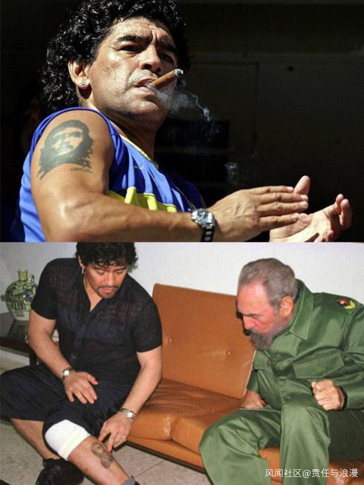 1960年10月30日,馬拉多納出生於阿根廷首都布宜諾斯艾利斯市維拉-費奧裏託區菲奧裏霍鎮的一户擁有8個孩子的貧困家庭。馬拉多納有兩大畢生之政治偶像:菲德爾·卡斯特羅與切·格瓦拉----兩位古巴共產黨的締造者與古巴獨立運動、反美帝國霸權主義的革命領導者。他將格瓦拉紋在他的右臂,將卡斯特羅紋在他的左小腿。