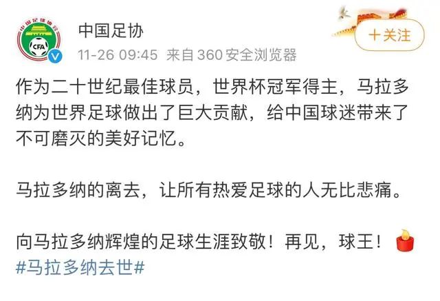 “作為二十世紀最佳球員,世界盃冠軍得主,馬拉多納為世界足球做出了巨大貢獻,給中國球迷帶來了不可磨滅的美好記憶。