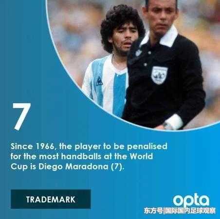 根據著名體育數據統計公司Opta的統計,馬拉多納是自1966年世界盃以來被判罰手球犯規次數最多的球員。