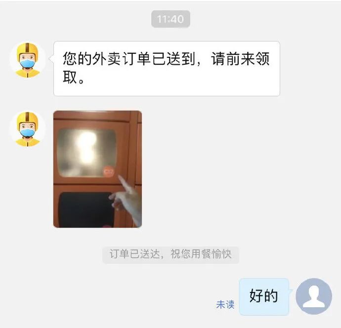 外賣小哥達到後只需要把餐食放進格口中,並給顧客打電話或者發短信就完成了配送。