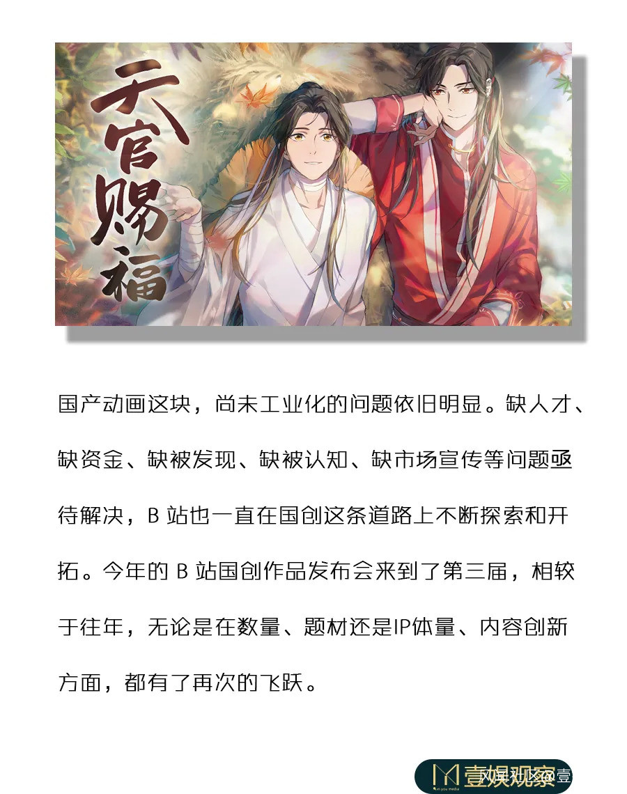 事實上,去年《天官賜福》出現在B站國創動畫作品片單中時,就已經引起了不小的關注。而11集的《天官賜福》還未播完,《天官賜福》特別篇已經出現在了B站2020—2021國創動畫作品的片單中。
