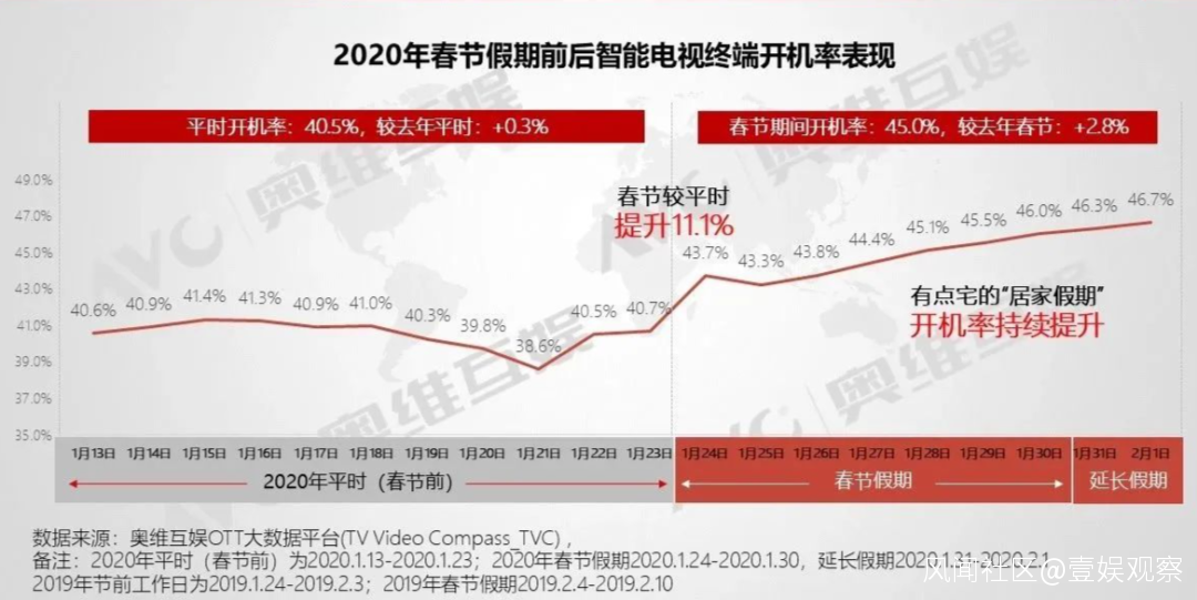 根據奧維互娛發佈的《2020中國智能電視用户春節洞察報告》顯示,今年春節期間智能電視開機率達到45.0%,整體較平時提升了11.1%。