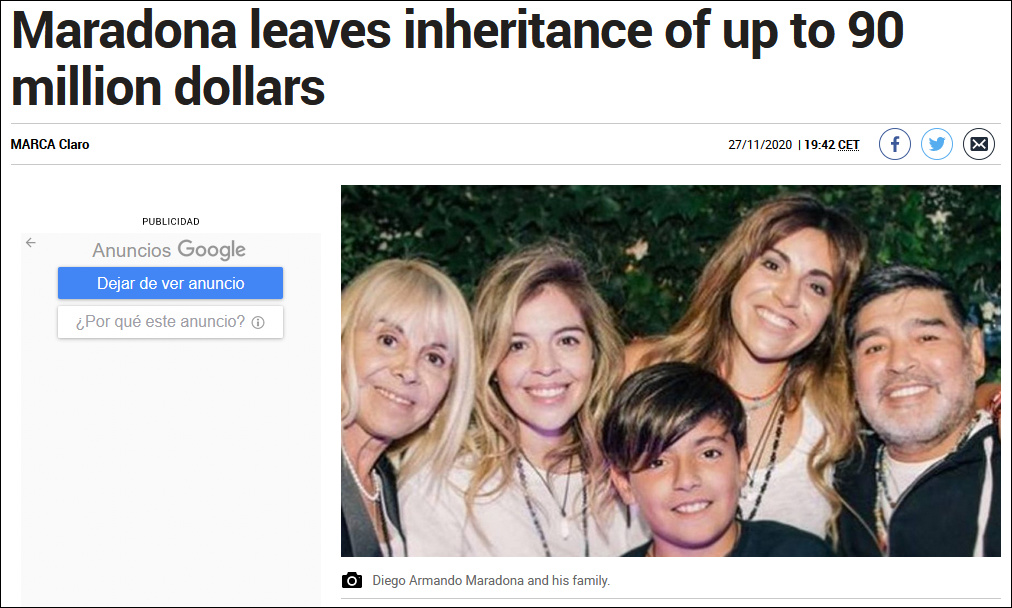 據西班牙《馬卡報》報道稱,現在的家庭鬧劇毫無疑問地發展到了馬拉多納的遺產上。